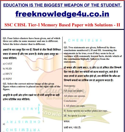 Free Download SSC CHSL Tier-1 Memory Based Paper with Solutions – I. This PDF is very useful for SSC and other competitive exams.