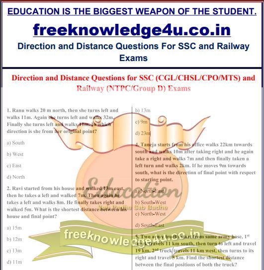 Direction and Distance Questions For SSC and Railway Exams. Here is Added Most Topic Of Direction and Distance. This PDF is Very Useful for SSC, Railway & Other Competitive Exams.