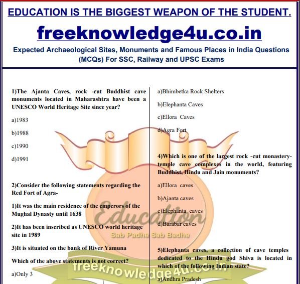 Expected Archaeological Sites, Monuments and Famous Places in India Questions (MCQs) For SSC, Railway and UPSC Exams. This PDF is Very Useful for SSC, Railway, UPSC & Other Competitive Exams.