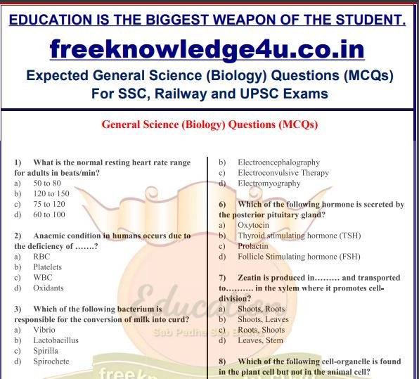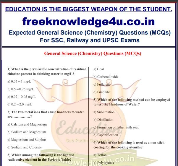 Free Download General Science (Chemistry) Questions (MCQs) For SSC, Railway and UPSC Exams. This PDF is very helpful of SSC, UPSC, Railway, and all Indian competitive exams.