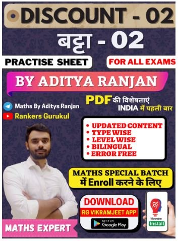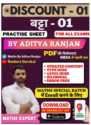 Free Download Discount Practice Papers published by Aditya Ranjan Sir. This is the best PDF of Discount Maths Chapters. This chapter covers most of the chapters for competitive exams. Like SSC, SSC MTS, SSC CGL, SSC GD, UPSC, and more competitive exams. आदित्य रंजन सर द्वारा प्रकाशित डिस्काउंट प्रैक्टिस पेपर मुफ्त डाउनलोड करें। यह डिस्काउंट मैथ चैप्टर का सबसे अच्छा पीडीएफ है। इस अध्याय में प्रतियोगी परीक्षाओं के अधिकांश अध्याय शामिल हैं। एसएससी, एसएससी एमटीएस, एसएससी सीजीएल, एसएससी जीडी, यूपीएससी, और अधिक प्रतिस्पर्धी परीक्षाओं की तरह।