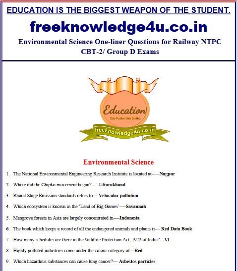 Environmental Science One-Liner Questions for Railway NTPC CBT-2/Group D, SSC Exam. Here is other related pdf and this pdf is very useful for other related exams.