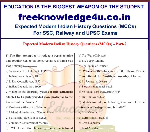 Modern Indian History Questions (MCQs) expected for SSC, Railway and UPSC exams. Most of the topics of Modern Indian History are covered here. This pdf is very important for SSC, UPSC, Railway and other competitive exams.