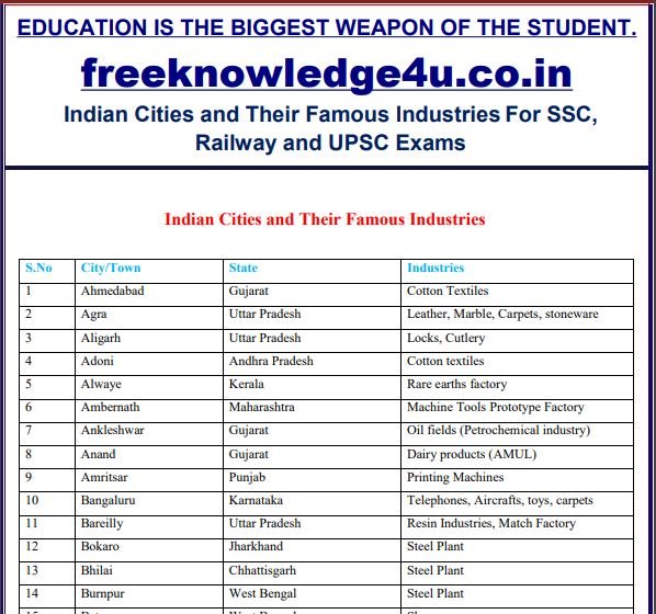 Indian Cities and Their Famous Industries For SSC, Railway and UPSC Exams.